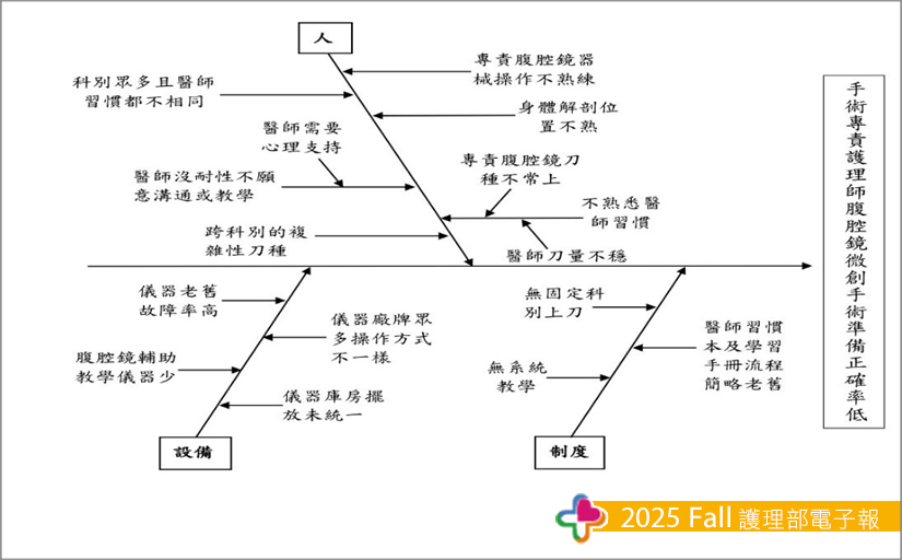 經由現況分析及問卷調查結果,確立造成「腹腔鏡微創手術準備正確率」低下主要導因:(如圖一)