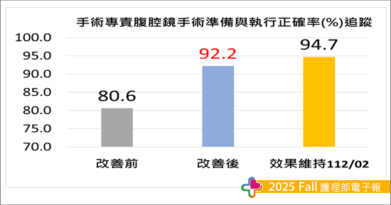 對策實施後以「腹腔鏡微創手術準備及執行正確率調查表」,對手術專責護理人員執行腹腔鏡微創手術準備之正確率調查,完整率由改善前80.6%提升至92.2%,(如圖三)。