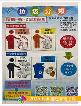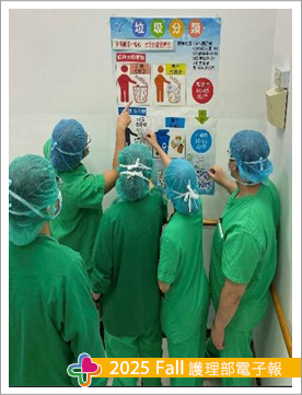 我們首先組成專案小組,由手術室專責護理、護理部、外科部、麻醉部等單位代表共同參與,整合各方經驗與資源。接著規劃專屬的醫療廢棄物分類教育課程,並將其列為每年必修,確保分類知識成為所有團隊成員的共同語言。
