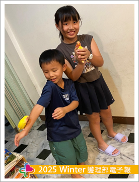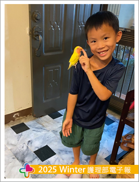 每天孩子們放學回家,第一件事就是跑去看鸚鸚和鵡鵡,晚上全家人聚在客廳,孩子會輕輕打開籠子,放牠們出籠玩耍,餵牠們吃蘋果片,有時小鳥停在手指上、肩膀上,孩子就會唱歌給牠們聽,就這樣家裡的每個角落都留下了牠們的蹤跡與全家人的歡笑聲,在這樣的互動中,我們也趁機教導孩子:「寵物是一個生命,愛牠們就要懂得付出,學會珍惜和照顧」,所以洗澡、清理鳥籠、換飼料、清理大便,這些都是飼主每天應盡的責任,有時弟弟會皺著眉頭說「我不要,好臭喔」,這時姊姊輕聲告訴弟弟:「照護一個生命,本來就要願意為牠付出,就像媽媽在醫院照顧病人一樣這麼辛苦」,姊姊的一句話,就像種子一樣,悄悄埋進了弟弟的心中,在看似平凡的日常裡,孩子們慢慢學會了承擔與體貼,也在生活中體會了責任與付出的意義。這些過程,正如我們在臨床上對病人的細心照護,觀察他們無法用言語表達的細微反應、眼神與肢體動作,每一個舉動都需要細心與耐心,更需要一份發自內心的同理與關懷,只不過,這一次,照護的對象換成了一個更需要溫柔對待的小生命。
