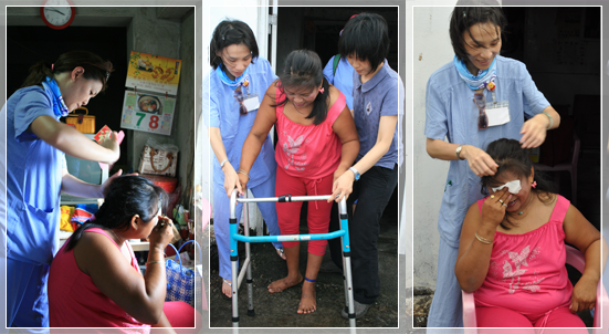 曉菁這一組由淑蘭護理師帶領到個案家,先由復健師進行評估後,隨即由我們接手,個案是50歲左右的女性,父親是達悟的頭目,因此要求我們稱她為公主,公主年輕時可是個洗髮精廣告明星,床邊貼滿年輕時的照片,一見到我們十分高興,便開始滔滔不絕地講起自己故事來了。我們一邊聽她說故事與她建立關係,一邊也在進行著評估。她因為車禍開了兩次刀,右側顳骨開刀後沒有放回,因此,右側顱部是凹陷的,活動上左腳無力、嚴重垂足,右腳則輕微垂足。活動空間多在一進門右側靠窗的病床上,居家環境雖用物多,但放置井然有序。行動不便,故自我照護較差。
