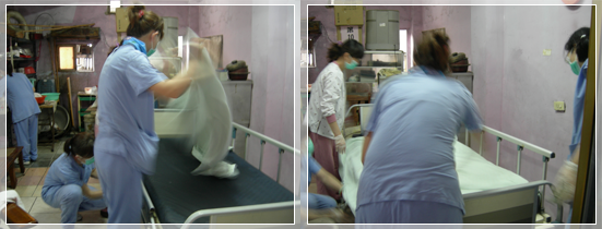 透過淑美大姐的協助,花了好長的時間與阿嬤溝通,終於說服阿嬤讓我們抱出來到外面的平台上,接受我們的身體清潔。淑美大姐說,阿嬤表示她沒有什麼可以給我們,所以希望我們不要對她太好。我們請淑美大姐告訴阿嬤,阿嬤只需要唱首歌給我們聽,我們就很高興了!阿嬤一聽立刻開心地唱起歌來了。唱完歌我們把阿嬤抱出來,卻找不到水源幫他擦身體,夥伴們靈機一動,想起我們昨日製作的水袋,正巧可以派上用場。於是,原本減壓用的水袋,竟成了儲水袋。幫阿嬤擦澡時,淑美大姐說:即使是協會的志工,都沒有辦法說服老人家接受她們幫忙擦澡,這真是太難得的畫面了!而且過程中,阿嬤一直要我們去看阿公,也幫阿公擦擦澡。