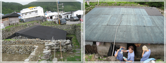 在傳統地下屋的這頭,我們訪視了四位獨居老人家,一對老夫婦一位住在主屋,一位住在工作室,兒子白天工作,要到晚上才送飯。訪視阿嬤時,阿嬤縮在工作屋中,所謂的大門是一塊木板遮掩著,聽到有人來了,以為我們是來送飯的,我們才知道阿嬤還沒用餐,於是想將帶來的營養品泡給阿嬤喝。只是一眼望去,工作屋附近連個水源都沒有,怎麼可能有開水,我們天真的想到水泥屋那去借開水,淑美大姐連忙說:「千萬不行!這是達悟的禁忌,別說取水,就算是經過別人家都不行。」,我們這才想起,這就是先前淑蘭說的禁忌之一。於是我們立刻改變策略,請方便給在東清的夥伴送些乾糧和衣物過來。