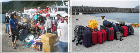 八點不到,永康奇美的夥伴便集結在實證護理辦公室,開始一箱一箱地將募來的物資送上小貨車。不一會兒的功夫,整台小貨車堆滿了物資,絲毫不浪費任何的空間。八點二十分,各地的夥伴終於到齊,看看這毒辣的太陽,毫不留情地烙印在大家身上,心想這幾天會是場硬仗了。將然而還未到達蘭嶼前,大家要面臨的除了兩個多小時到後壁湖的車程外,最大的挑戰莫過於從後壁湖搭船到蘭嶼了,這段兩個半小時的船程,想起來就頭發麻,還是趕緊吞下暈船藥吧!今天晴空萬里,大家拼命祈禱風浪不要太大。只是這樣的美夢,一進入巴士海峽,就完全破滅,巴士海峽果然不是蓋的,風浪大到從睡夢中驚醒,就像搭海盜船般的刺激,讓我們沒看到鯨魚,只見到一堆兔子漫步。反覆這樣擺盪超過百次,許多夥伴吐到臉發白,幸好大家依然有堅定的信念,撐住了接下來在蘭嶼四天的服務行程。