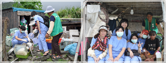 | 與志工一同幫助阿公進行環境整理 阿公帶起墨鏡對我們表示善意回應 |
