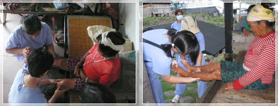 今日訪視對象中,有位需要傷口照護的病患,住在現代水泥屋的這頭,居家環境條件是不錯的。據了解目前病患無論大小傷口,都要大老遠到衛生所進行換藥,評估後發現,個案傷口十分簡單,如果主要照顧者可以執行,其實只要衛教家屬自行換藥即可,不需大老遠到衛生所去。於是我們說服了個案及照顧者學習換藥的技巧,並接受我們的身體清潔照護。