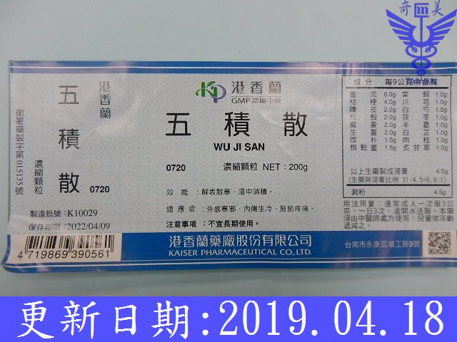 陳皮2、蒼朮8、厚朴1.5、炙甘草1、半夏1、茯苓1、當歸1、白芍1、川芎1、炮乾薑1.5、桔梗4、肉桂1、麻黃2、白芷1、枳殼2、生薑2