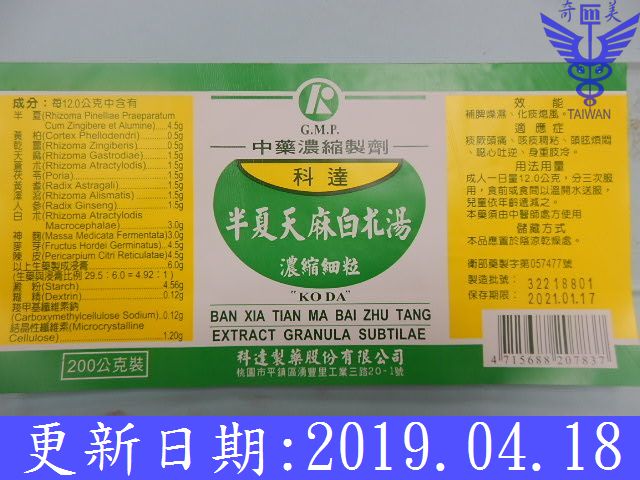陳皮1.5、半夏4.5、茯苓1.5、白朮3、乾薑1、麥芽4.5、神麴3、黃耆1.5、人參1.5、澤瀉1.5、黃柏1、天麻1.5、生薑3