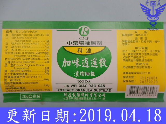 牡丹皮2.5、梔子2.5、柴胡4、當歸4、白朮4、白芍4、茯苓4、炙甘草2、薄荷2、煨薑4
