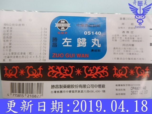 熟地1.4、山藥0.7、枸杞0.7、山萸肉0.7、牛膝0.5、菟絲子0.7、鹿角膠0.7、龜板膠0.7
