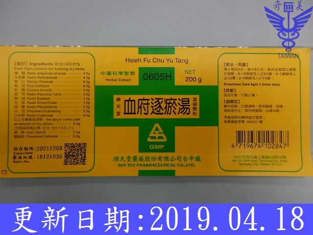 | 組 成 | 桃仁6、紅花4.5、當歸4.5、生地4.5、赤芍3、川芎2.3、柴胡1.5、枳殼3、甘草1.5、桔梗2.3、牛膝4.5 |