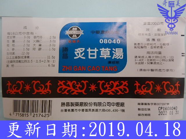 炙甘草1.5、人參0.9、生地3.6、麥冬3.6、桂枝0.9、火麻仁0.9、生薑0.9、大棗0.9、阿膠1.5