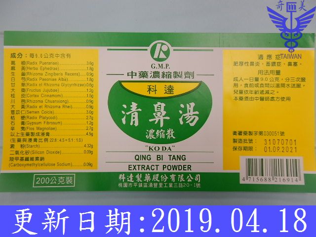 葛根3.6、川芎0.9、麻黃1.8、大黃0.9、桂皮1.5、甘草0.6、白芍1.8、生薑0.9、桔梗2.7、石膏1.2、辛夷2.7、大棗1.2、薏苡仁3