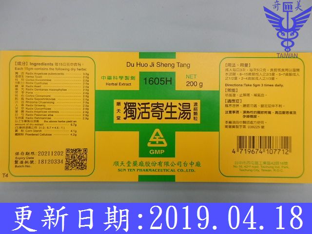 獨活1.5、桑寄生1.5、秦艽1.5、防風1.5、細辛1.5、川芎1.5、當歸1、白芍藥1、生地1、桂心1.5、茯苓1.5、杜仲1.5、川牛膝1.5、人參1.5、甘草1