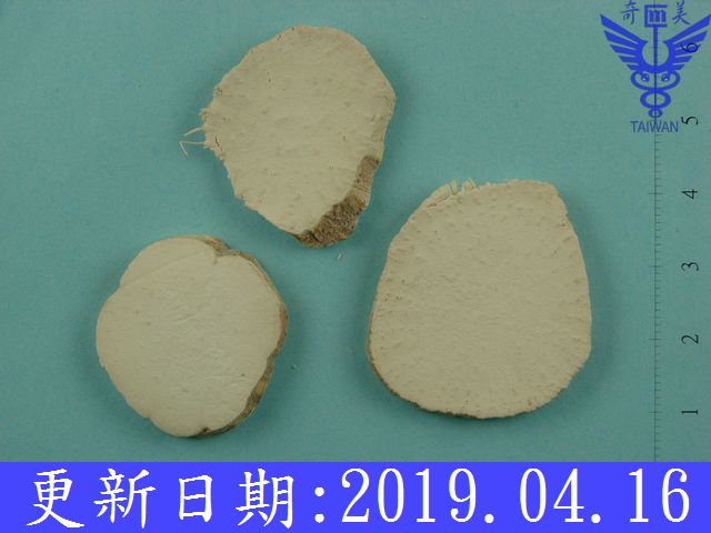 | 鑑 別 | 呈不規則圓柱形,縱剖成半圓柱形或瓣塊狀,長8∼16 cm,直徑l.5∼5.5 cm。表面黃白色或淡棕黃色,有縱皺紋、細根痕及略凹陷的橫長皮孔,有的有黃棕色外皮殘留,質堅實,斷面白色或淡黃色,富粉性,橫切面可見黃色木質部,略呈放射狀排列,縱切面可見黃色條紋狀木質部。無臭,味微苦。 |