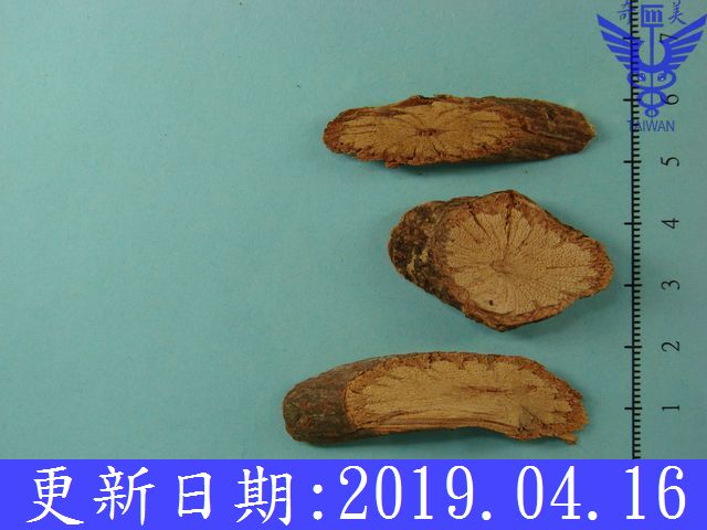 斷面皮部薄,棕色,形成層環棕黑色,木部淡黃色至棕色,髓部小,射線清晰可見。