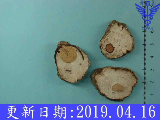 | 鑑 別 | 本品外形與茯苓同,惟中間有松根貫穿,商品多切成方形薄片,質堅實,具粉質,松根部份呈棕黃色,表面有年輪。色澤不分,每塊含有松木心。厚度0.4∼0.6 cm,長寬4∼5 cm。木心直徑不超過1.5 cm。 |