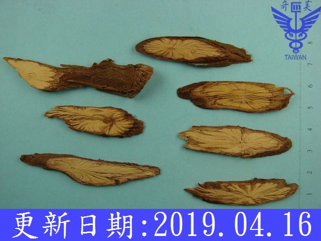 | 鑑 別 | 根呈圓柱形,略彎曲。長 8∼25 cm,直徑0.5∼1.5 cm。表面紅棕色或灰棕色,有縱皺紋及支根痕。外皮粗糙,易成片狀剝落。根莖具節,節間長 0.7∼2 cm。表面有橫長突起的皮孔。體輕,質硬而脆,斷面皮部黃白色,木部淡黃色或黃色,射線放射狀,中部有髓。氣微,味微苦。 |