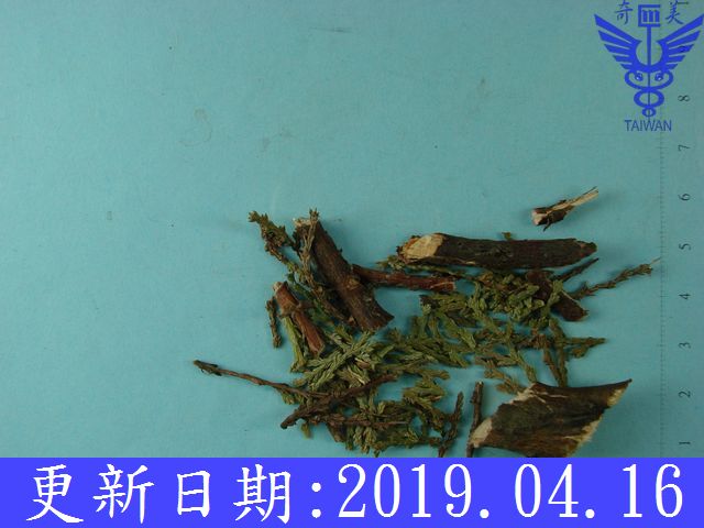 | 鑑 別 | 多分枝,小枝扁平,長短不一。葉細小,鱗片狀,背腹向葉兩面露出部分為斜方形,葉片中央具腺槽,先端鈍,交互對生排列成4列,緊密貼伏於小枝上,成熟枝上葉漸稀疏,深綠色或黃綠色。質脆,易折斷。氣微清香,味苦澀,微辛。 |