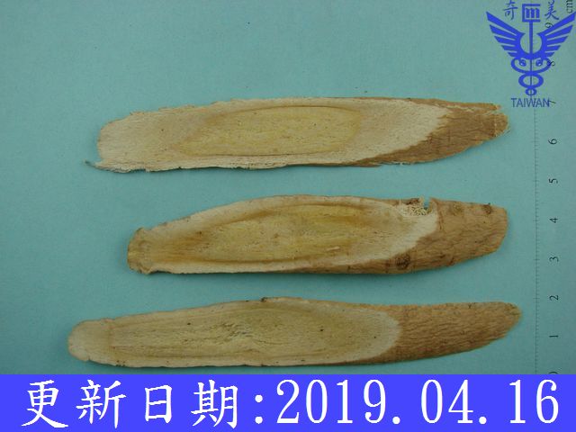 | 鑑 別 | 呈圓柱形,極少有分枝,略扭曲,上粗下細,長10∼90 cm,直徑1∼3.5 cm。表面灰黃色或淡棕褐色,有縱皺紋及橫向皮孔。質硬略韌,斷面纖維性,並顯粉性,皮部黃白色,約占半徑的1/3,木部淡黃色,有菊花心,呈顯放射狀紋理及裂隙。氣微,味微甜,嚼之有豆腥味。 |