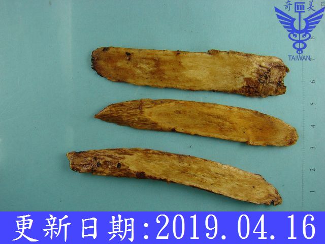 | 鑑 別 | 呈圓柱形,極少有分枝,略扭曲,上粗下細,長10∼90 cm,直徑1∼3.5 cm。表面灰黃色或淡棕褐色,有縱皺紋及橫向皮孔。質硬略韌,斷面纖維性,並顯粉性,皮部黃白色,約占半徑的1/3,木部淡黃色,有菊花心,呈顯放射狀紋理及裂隙。氣微,味微甜,嚼之有豆腥味。 |