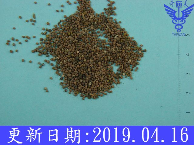 | 鑑 別 | 近球形或卵形,直徑1∼1.5 mm;表面灰棕色或黃棕色,微粗糙,放大鏡下觀察,種皮具細密小點,並有不均勻分布的白色絲狀條紋;種臍近圓形,位於種子頂端;種皮堅硬不易破碎,用沸水浸泡表面有黏性物,煮沸至種皮破裂,露出黃白色細長捲旋狀的胚,稱“吐絲”。無臭,味微苦、澀。 |