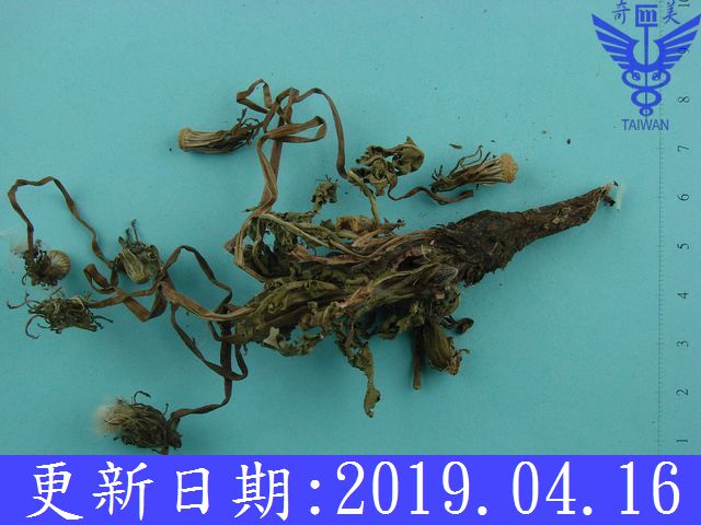 | 鑑 別 | 全草呈皺縮捲曲的團塊,葉基生可見,多皺縮破碎,完整葉片展平後,呈倒披針形,邊緣倒向淺裂,裂片齒牙狀,根圓錐狀,多彎曲,有的可見頭狀花序,其上密生多數具白色冠毛的瘦果。 |