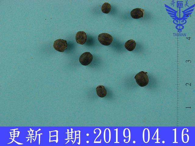 | 鑑 別 | 呈圓球形,直徑4∼6 mm。表面灰黑色或黑褐色,布有微細灰白色粉霜狀茸毛,有縱向淺溝4條;頂端微凹,基部常有灰白色宿萼及短果柄,宿萼包被果實的1/3∼2/3,先端5齒裂,常1∼2深裂,外表面灰白色,密布細茸毛。質硬,不易破碎,橫剖面果皮厚,淡灰黃色,外有棕色油點,內果皮分成4室(4果核),每室含棕黑色種子1 粒,種仁富脂肪油。氣芳香,味淡、微辛。 |
