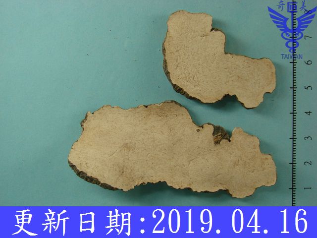 | 鑑 別 | 呈條狀、類圓形或扁塊狀,有的有分枝,長5∼25 cm,直徑2∼6 cm。表面黑色、灰黑色或棕黑色,皺縮或有瘤狀突起。體輕,質硬,斷面類白色或黃白色,略成顆粒狀。 |