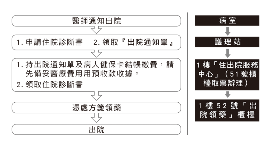 - 先至1 樓「住出院服務中心」預繳住院費用,出院時多退少補。