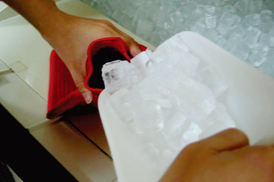1.將冰塊裝入冰枕1/2-2/3滿,並加入少許清水。