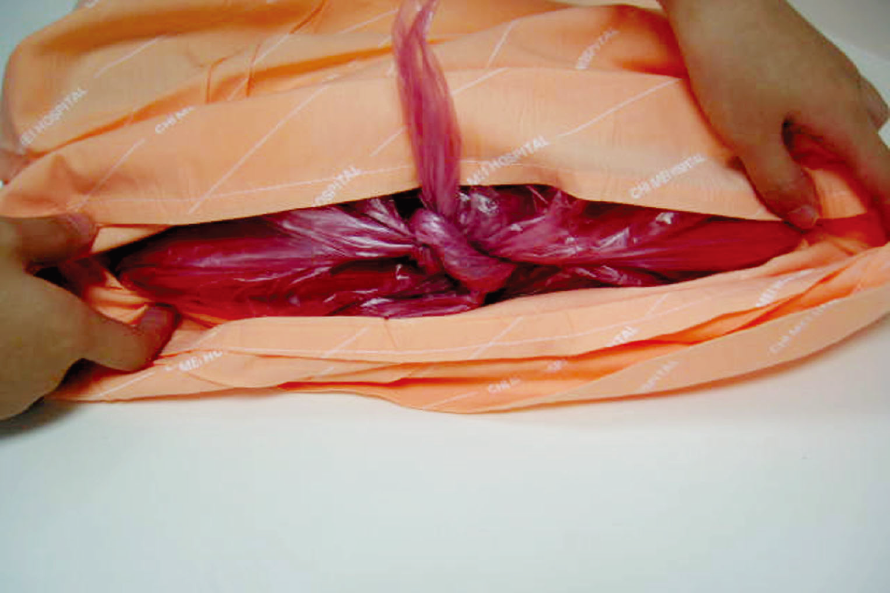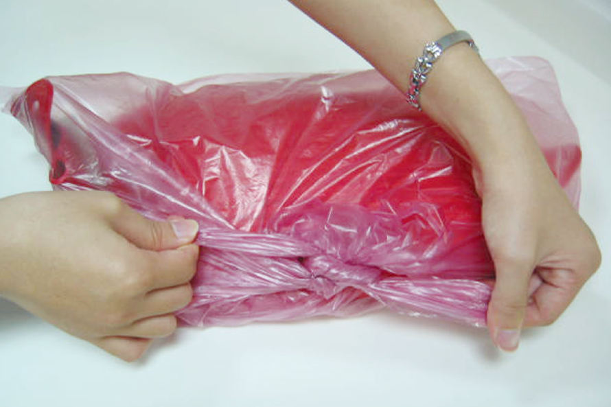 3.套上塑膠袋及枕頭套,袋口應朝向塑膠袋內放置。