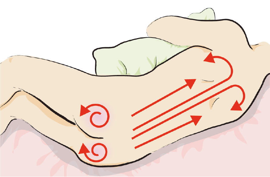 2.於背、臀部塗抹少許乳液,用按撫法由臀部往上按摩至肩膀,再往下按摩到臀部。