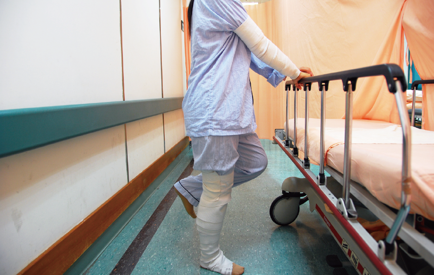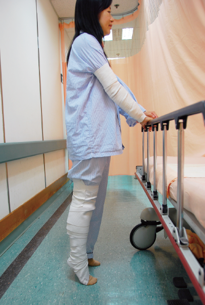 病人手扶著床邊扶手,兩腳作出墊腳尖的動作。
