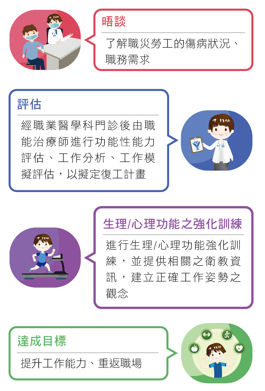 為減少勞工等待或嘗試復工期間所耗費的時間、醫療與社會成本,本院職能復健專業機構為職災勞工擬訂
