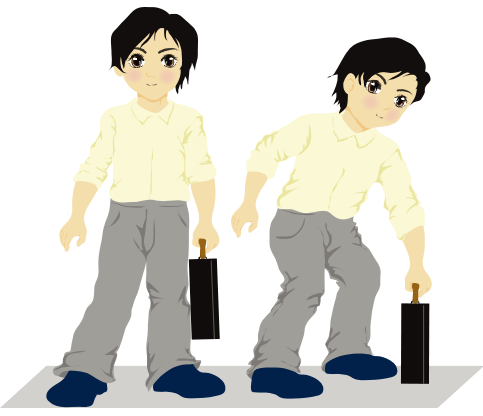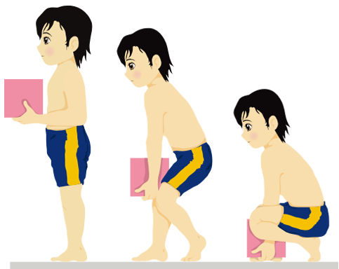 - 彎身:彎身時,先彎曲膝蓋,再輕輕將上背部向前彎。千萬不可將膝蓋打直彎身。