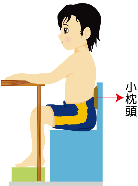 - 辦公桌坐姿:雙腳放在矮凳上,使雙腳有⽀撐,背部靠近椅子後方,並在下背處放一小枕頭。