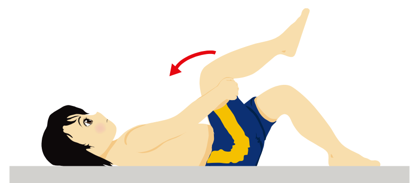 - 伸展運動:平躺,雙膝伸直,用雙手抱住一腳膝蓋後側拉回向胸前,停住六秒,再換另一腳。最後抱住雙膝拉向胸前,停住六秒。