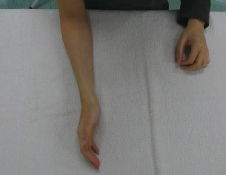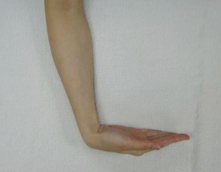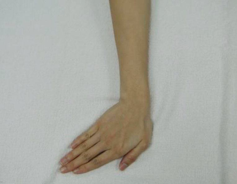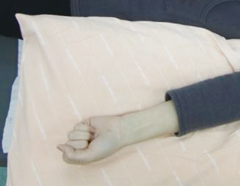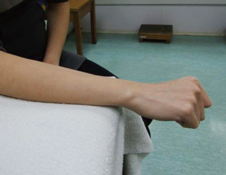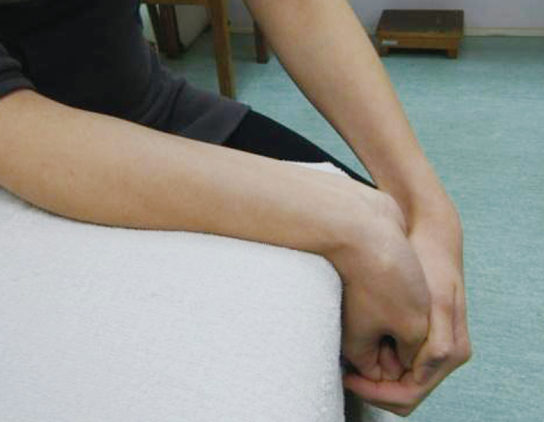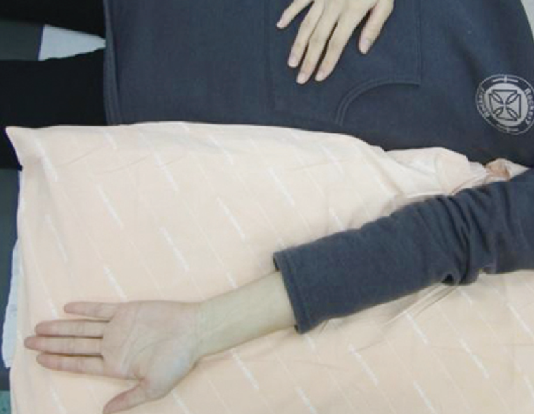 - 肘部彎曲:坐於桌旁,儘量桌邊,手前伸平放於桌面,緩慢的將手縮回,並利用身體前彎將手肘帶到彎曲的位置。
