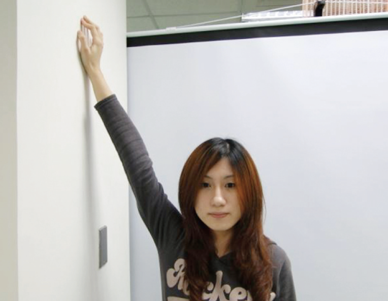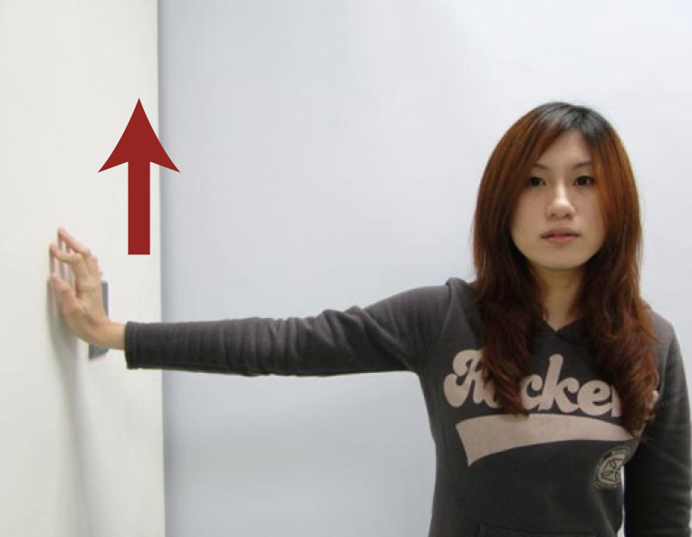 - 側爬牆運動:側對牆壁,將手掌平放於牆上,利用手指頭的力量慢慢的向上爬,過程中避免聳肩。