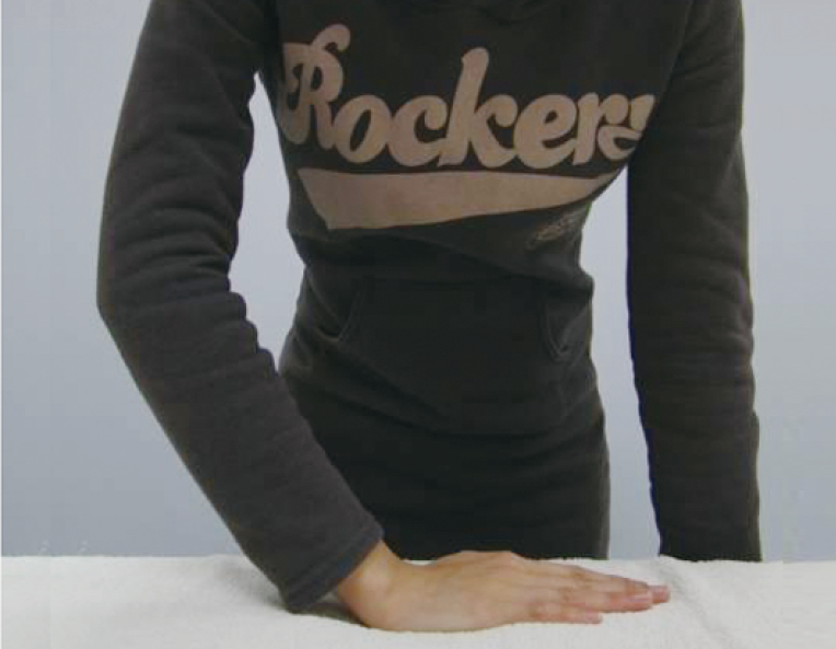 - 肘部伸直:面對桌子站穩,將手掌平於在桌面,手肘朝外,利用健側手將手肘帶至伸直的位置。