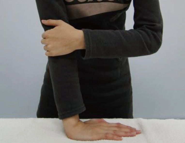 - 肩部內轉:左手肘彎曲至90度,上臂貼緊身體,手心朝向右手的方向,利用右手將左手臂緩慢的帶到腹部的位置。