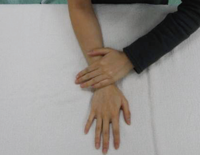 - 前臂內外旋轉:面對桌子坐好,手肘彎曲至90度,上臂貼緊身體,前臂平放於桌面,緩慢地利用健側手將前臂帶至手心向上的位置,再反之將其帶至手心向下的位置。