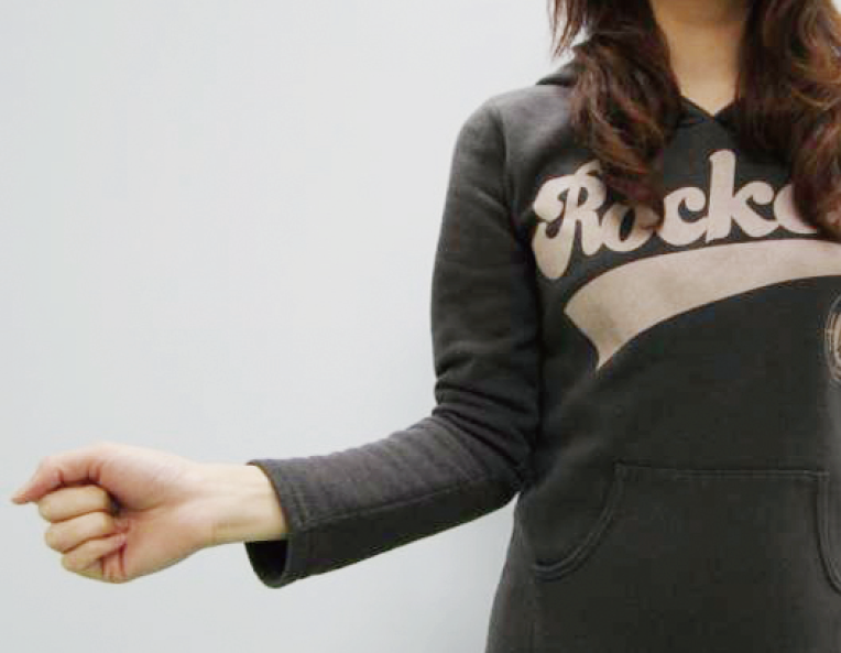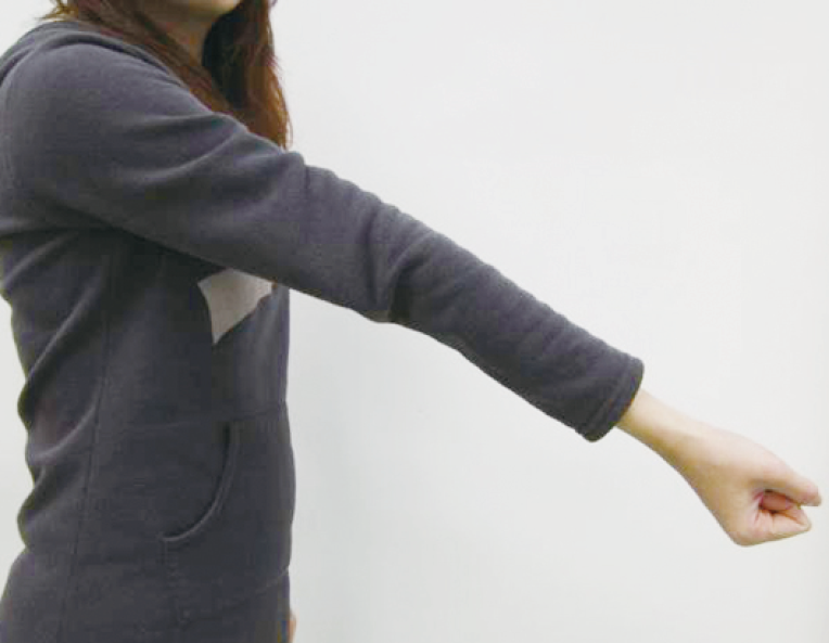 - 肩部旋轉:上手臂貼緊身體,手肘彎曲至90度,手心向內,再將前臂往身體靠近,反之則儘量打開。