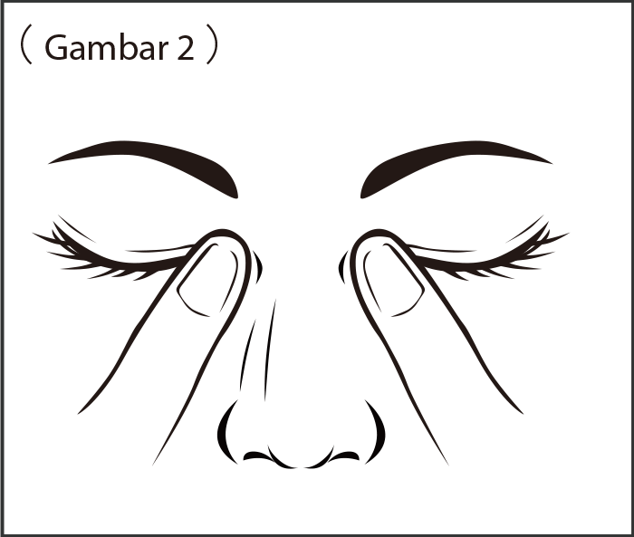 - Setelah menetes obat, kendorkan jari tangan, dan mata lihat ke bawah, lalu tutup mata sekitar 1-2 menit, putarlah bola mata dengan pelan, tekanlah sudut dalam kelopak mata dengan lembut (dekat batang hidung) (gambar2), untuk mencegah obat tetes mata masuk dari lubang hidung ke dalam tenggorokan, yang bisa mengakibatkan reaksi yang tidak baik pada tubuh.
