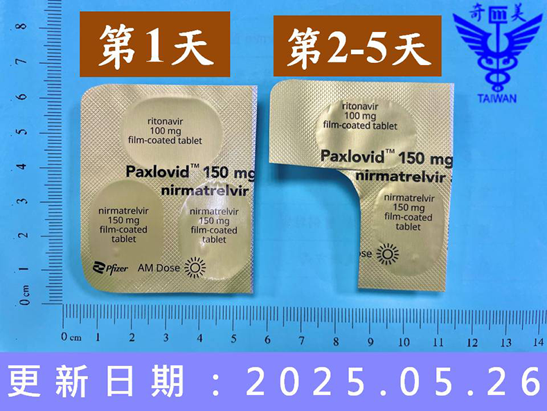 - 藥片上相同顏色區塊的3錠藥品為2錠Nirmatrelvir(粉色)與1錠Ritonavir(白色)。腎功能正常病人每次服用同顏色區塊的3錠藥品(2粉1白),每日兩次,共5天。