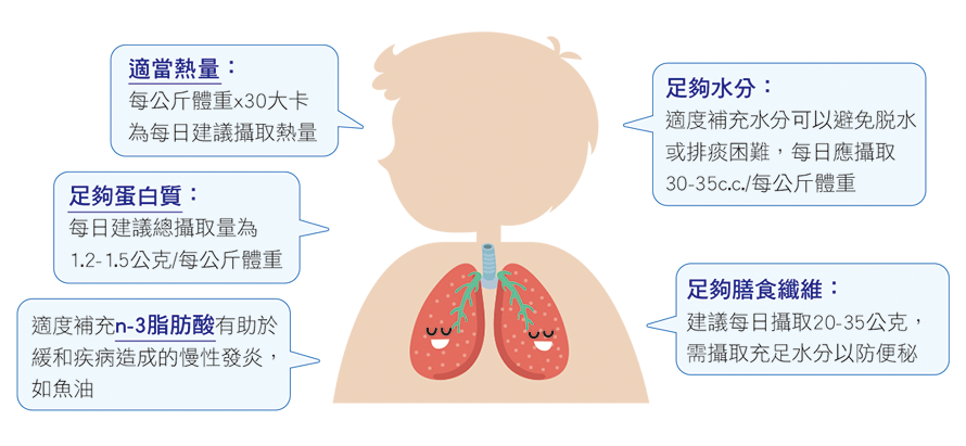 足夠熱量及蛋白質之飲食,可以補充過度消耗的能量及增強呼吸肌肉功能,增加或維持理想體重可以避免肌肉流失造成的肌肉無力,改善免疫能力及生活品質。