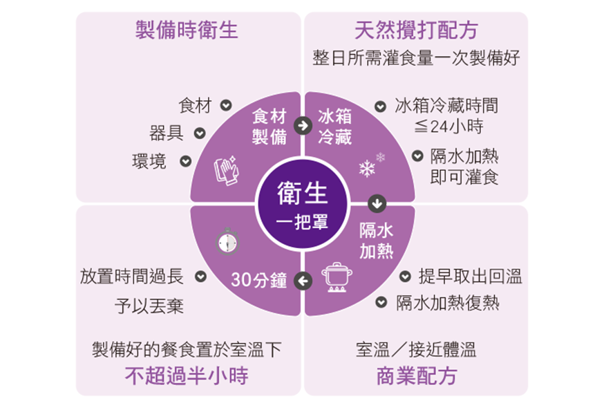 - 管灌飲食商業配方或天然攪打配方種類選擇,可請營養師協助依臨床狀況評估,給予適當的配方建議。