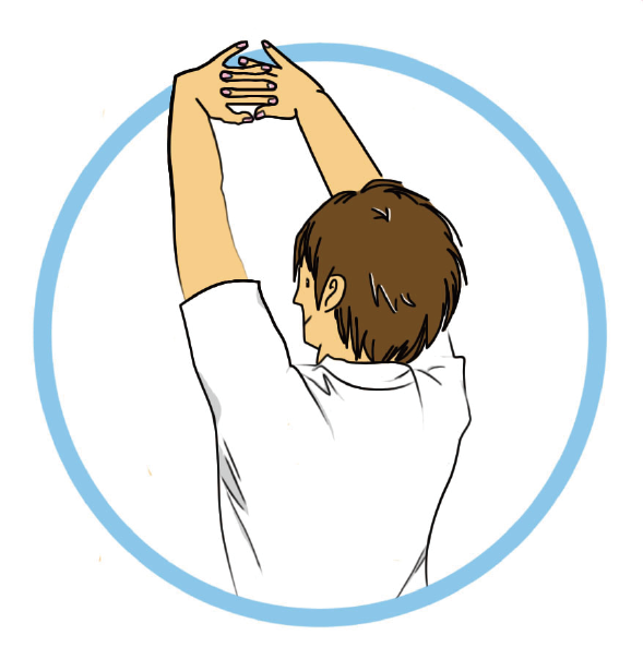 雙手十指緊扣,反掌向前推出去,再緩緩往上舉到頭頂