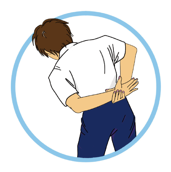 背後拉手,肩膀向痛側傾斜,臀部擺向對側,順勢將手拉高